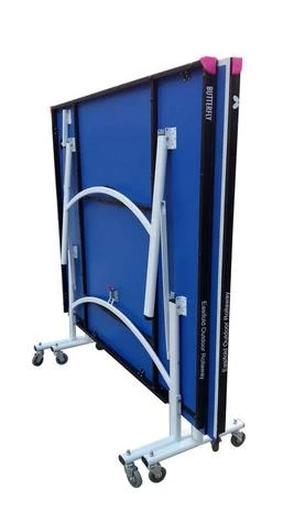 With a Butterfly 12mm plywood resin weatherproof playing top, this table provides a good bounce and playing performance combined with an 8 wheel system with economic storage and lighter rollaway benefits. This table is ideal for hotel and home use. It divides into 2 halves which makes movement and storage simple and easy. It comes with a full length cover, outdoor net and post set, 2 bats and 3 balls.