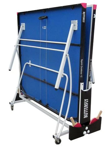 With a stylish and elegant look the Spirit 12 Rollaway with a Butterfly 12mm plywood resin weatherproof top produces a good bounce and a playing performance similar to many quality indoor tables. It is combined with the quickest and easiest system for setting up your table. Included is a full length weatherproof cover, a Butterfly outdoor net and post set, 2 bats and 3 balls, making it an ideal table for use in hotels and for the home.