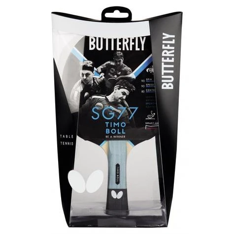 The Timo Boll SG77 features a strong 5 ply blade with a comfortable concave shape handle and the “Smart Grip” technology. This combined with Butterfly ITTF approved red and black Pan Asia rubber with 1.8mm sponge providing a bat with increased spin, speed and good control.